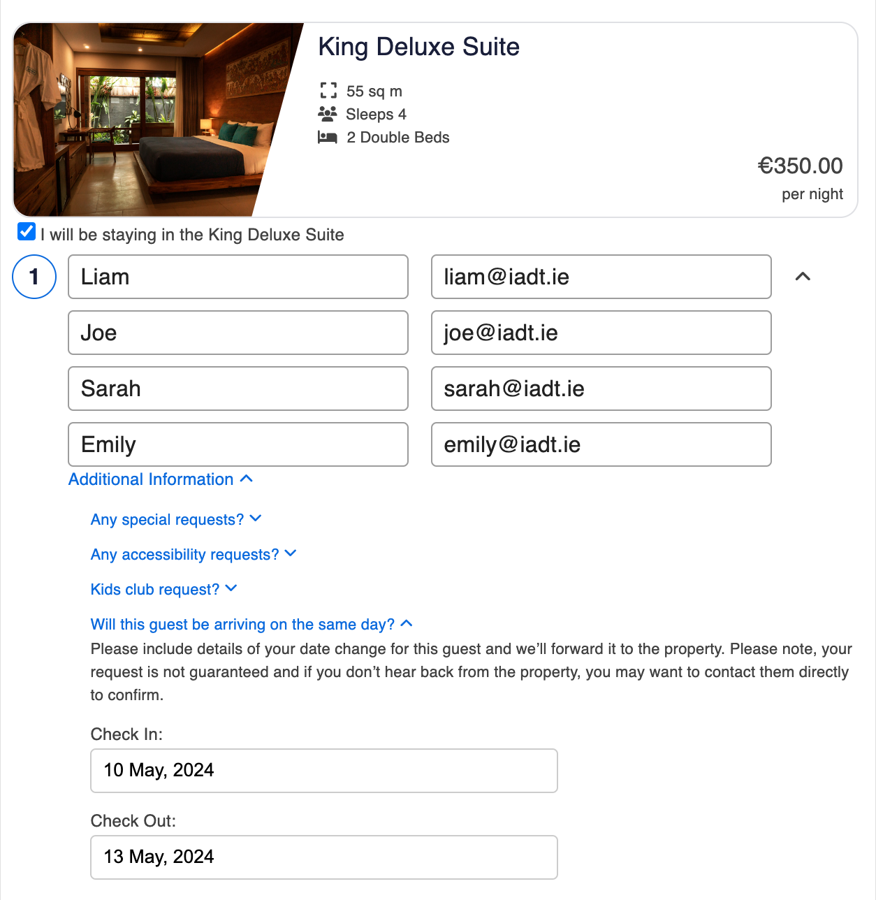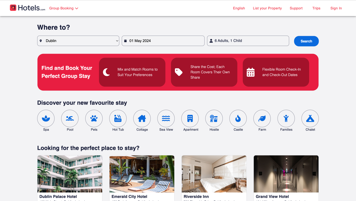 This document explores the enhancement of the Hotels.com platform to facilitate group bookings, focusing on user experience and functionality. The goal is to develop a section within the platform that simplifies the booking process for large groups through streamlined features. The thesis was created using a user-centred design approach encompassing several stages, including initial research, design, development, and testing, and uses modern web development practices and technologies. Throughout the process, feedback was actively integrated to refine the system, with the final objective of making group bookings more accessible and efficient, thereby improving the overall user experience on the platform.
