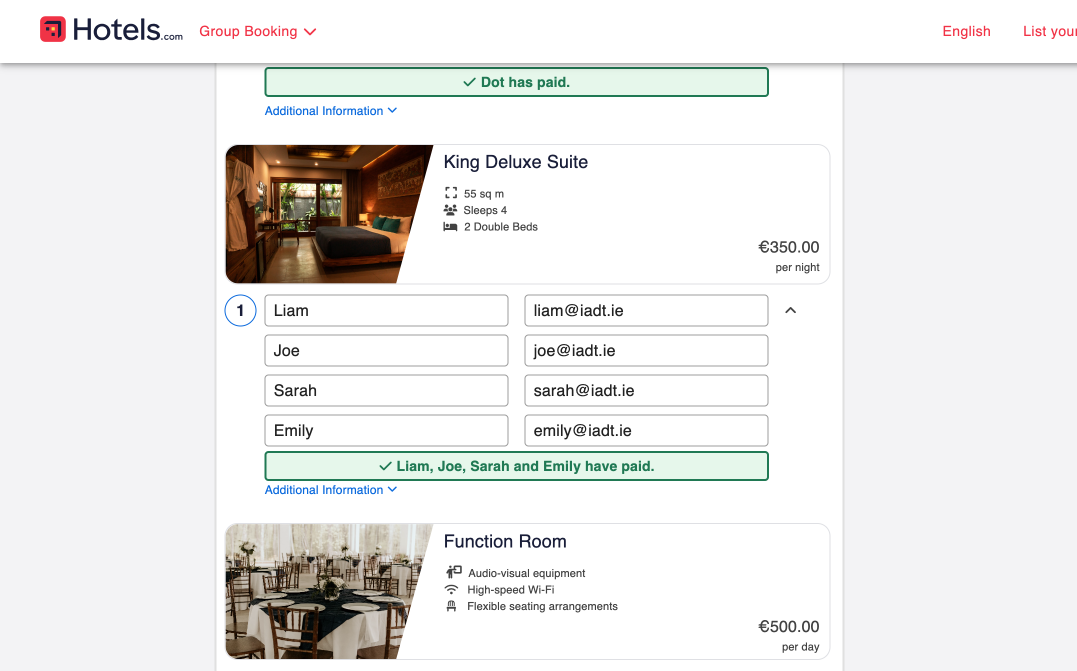 The project's objective was to simplify group reservations, specifically for large events, within Hotels.com. It aims to address the common challenges faced by group organisers by offering flexibility in room selection and accommodating various preferences and arrival schedules. The system features a payment structure designed to simplify financial management and also includes a feature for easily reserving hotel function spaces, which streamlines the booking process. The project is supported by a structured thesis framework and aims to enhance user experience by improving booking standards in the hospitality industry by prioritising convenience and flexibility.