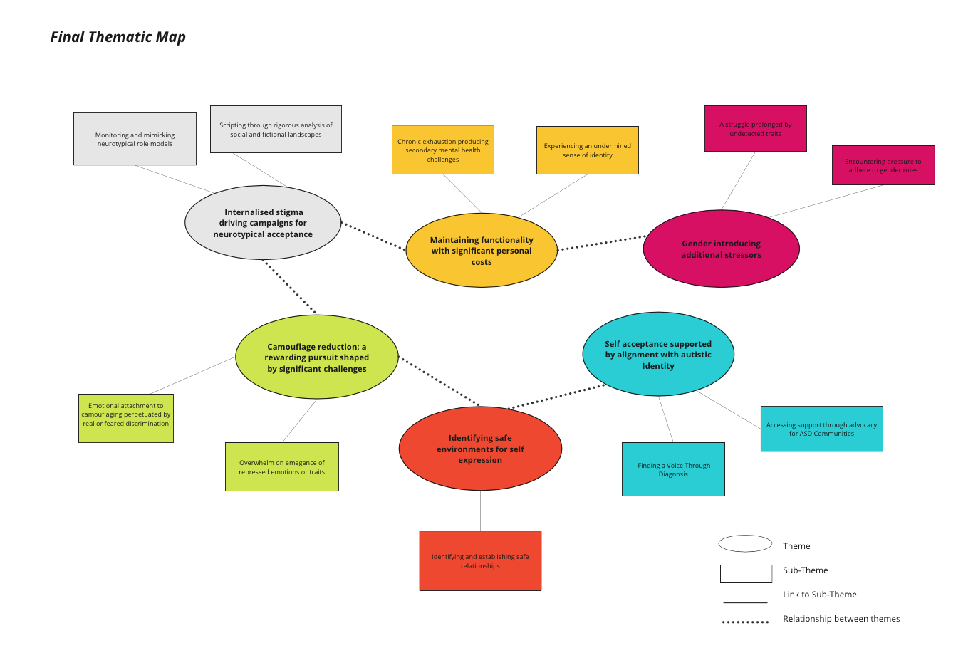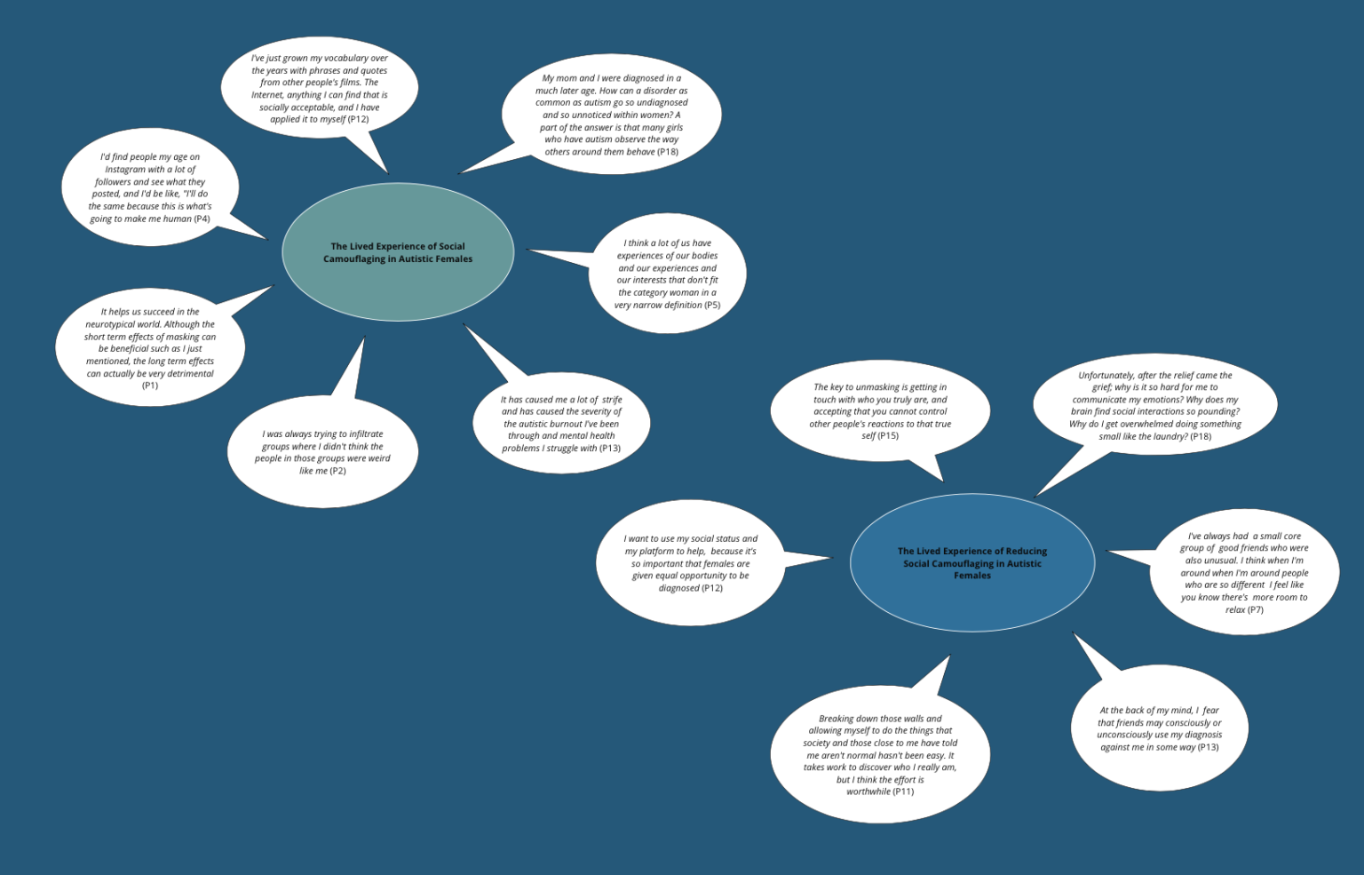 Six main themes, each accompanied with a varied number of sub-themes, were developed by employing a Reflexive Thematic Analysis methodology. Such themes included Internalised Stigma Driving campaigns for Neurotypical Acceptance, Maintaining Functionality with Significant Personal Costs, Gender Introducing Additional Stressors, Camouflage Reduction: A Rewarding Pursuit Shaped by Significant Challenges, Identifying Safe Environments for Self-Expression and Self-Acceptance Supported by Alignment with Autistic Identity. The results particularly emphasised the role of social-identity alignment and internalised stigma in both engagement and reduction of social camouflaging; demonstrating the applicability of identity-based theories in conceptualising the phenomenon. Regarding practical implications, the research findings indicated the potential benefits of females accessing community-based supports post-diagnosis. For instance, attending peer support groups, facilitated through organisations such as As I Am, may assist autistic females in accepting their identity; consequently reducing engagement in social camouflaging behaviour.