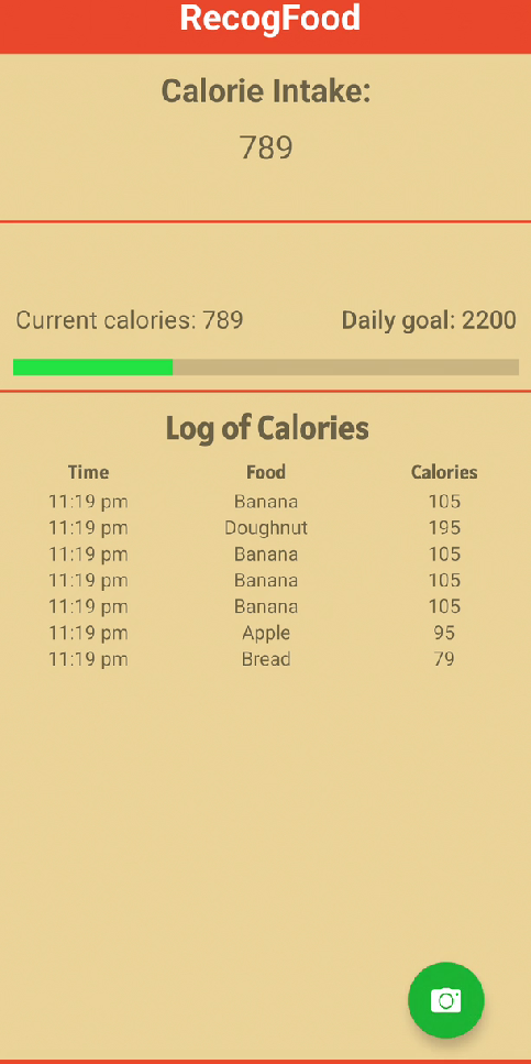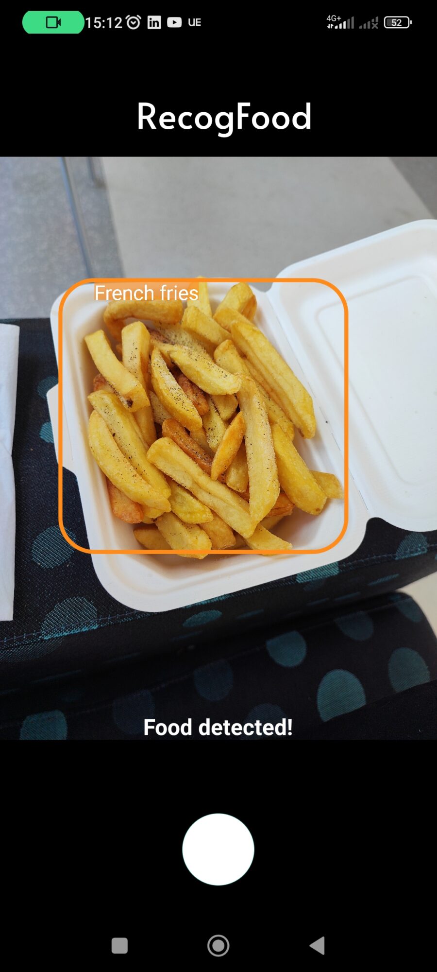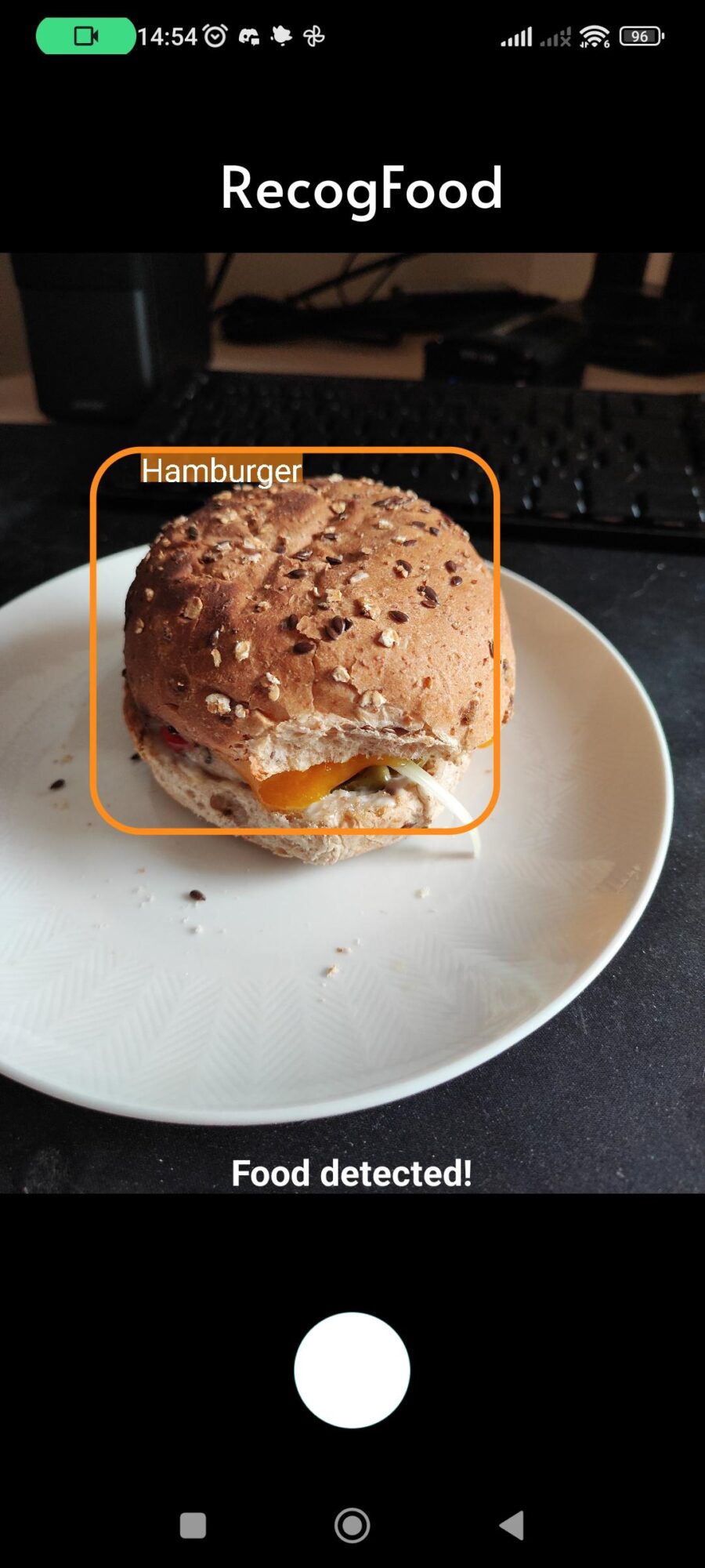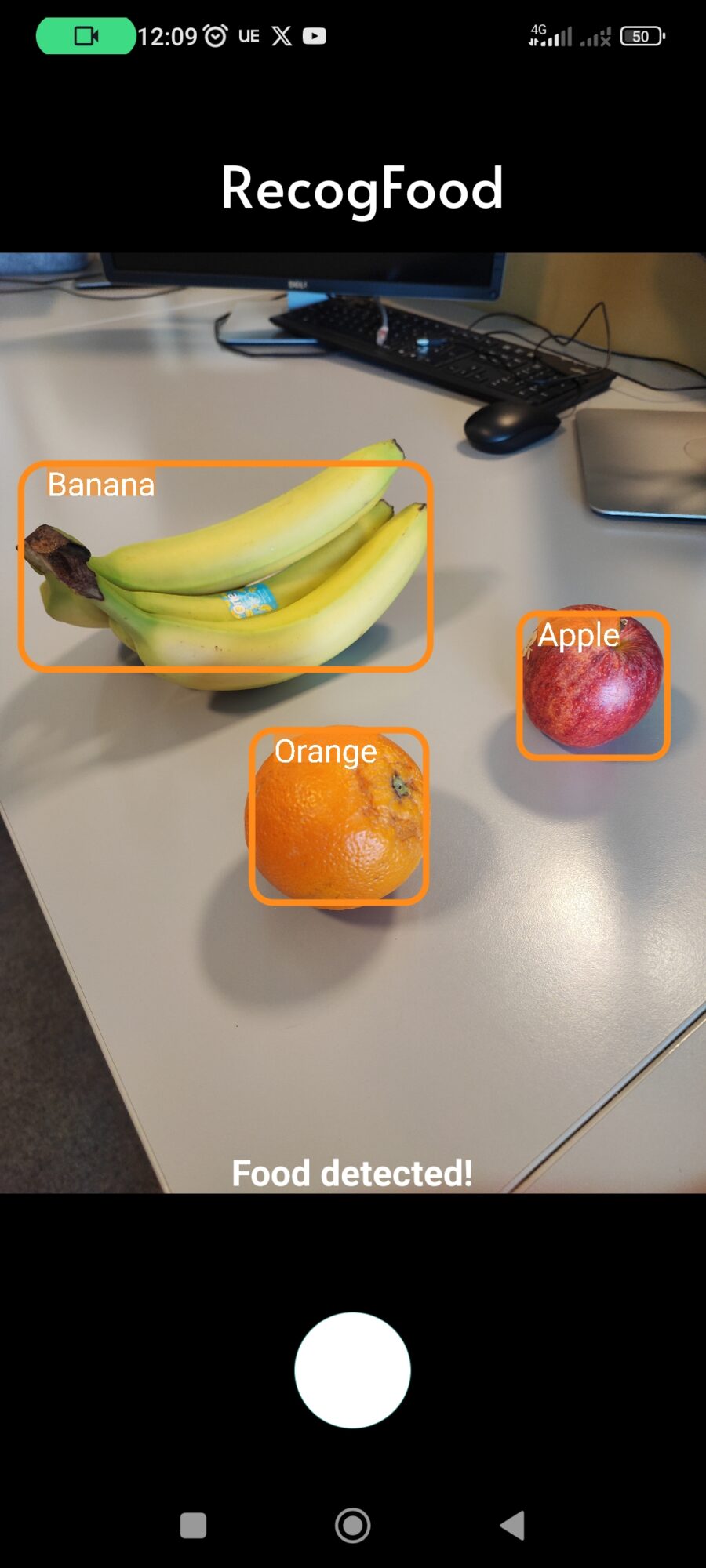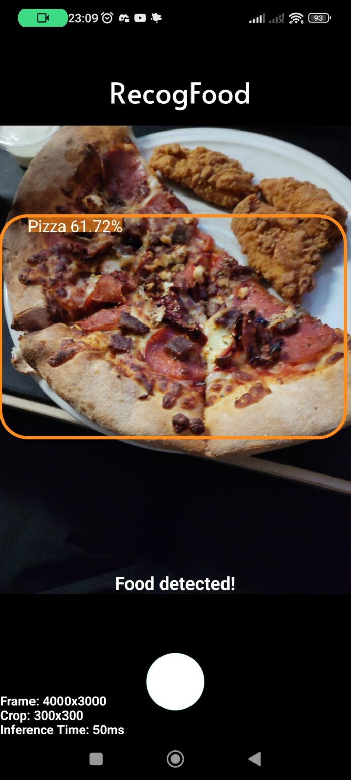 RecogFood is an application that utilizes a computer vision technology to detect and recognize certain food items. By having the user to use camera feature, it is capable of detecting the food items in real-time, which can detect a single quantity or multiple quantities on the image. The application then inputs the calorie count for each food item from the image that is selected by the user. It's intended to keep track of the calories eaten, setting a limit of the calories consumed, and getting the names of certain food items that might be unknown to the user regarding their language and vocabulary.