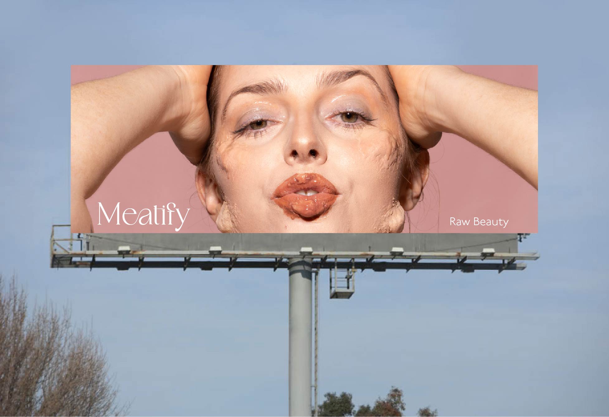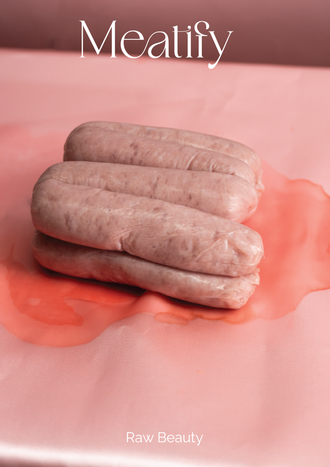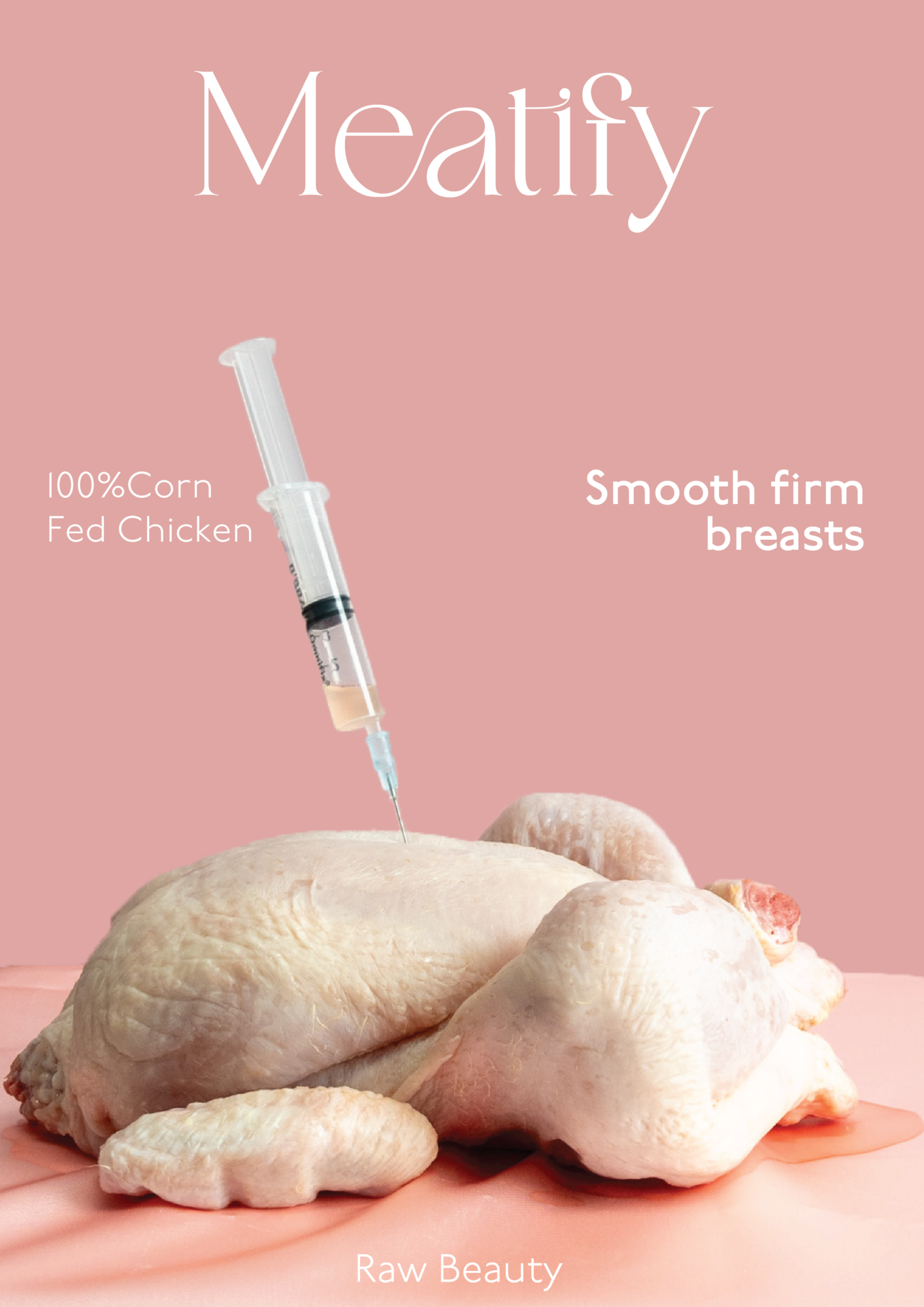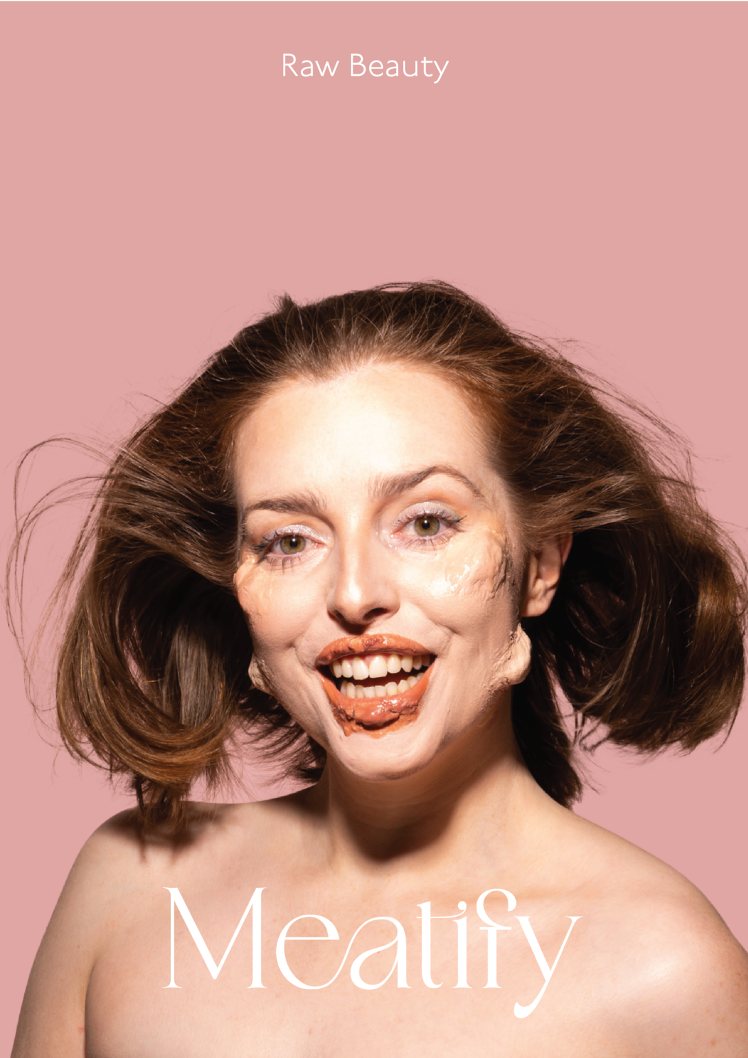Meatify is a speculative design project aimed at highlighting the deceptive practices of the cosmetic industry — while also shining a light on the ridiculous lengths people will go to change their appearance. The idea stemmed from a stat stating that girls view over 500 ads a day, telling them how they should look. Raw meat was used to show people how convincing the industry can be — by putting a horrific thing in a "beautiful" setting, while contrasted with soft feminine tones. Meatify takes the byproducts from the meat industry and extracts the animal fat to create a natural filler to enhance the face and body.