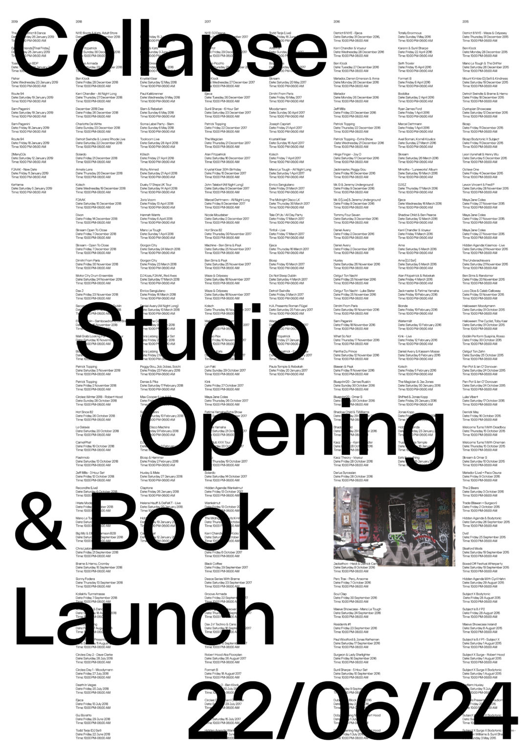 At their opening Collapse will also launch their first publication; ‘Encyclopedia of Lost Spaces 1990-2024'. The book attempts to quantify the benefits of culture on social capital. One of the most important aspects of the book is to inform emerging creatives of the what was there in the past, and what has been lost.