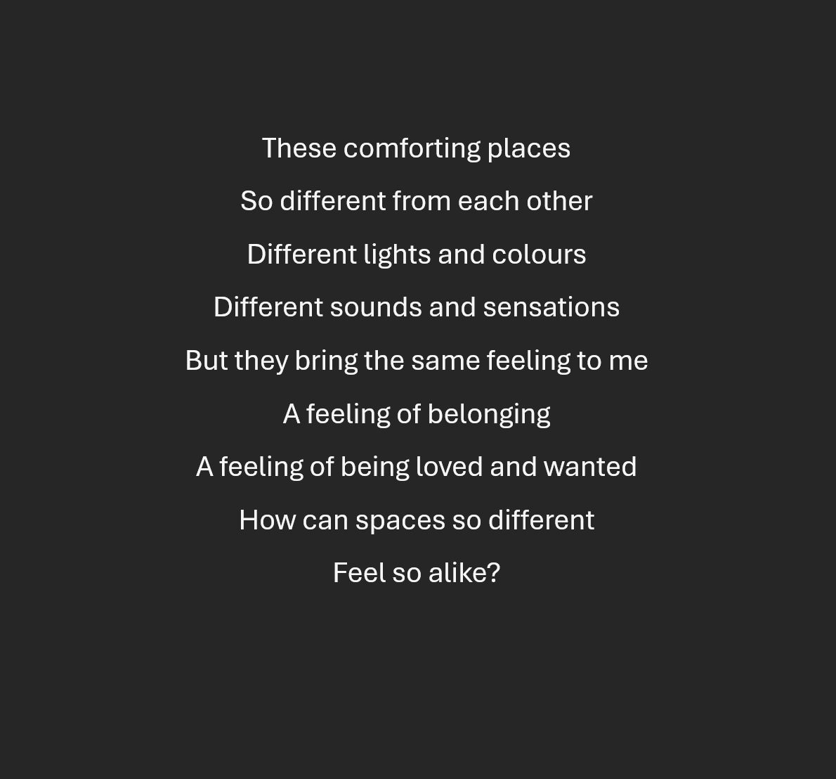 How I spend my time is a double exposure analogue photography project. The concept for this project is the juxtaposition between the artist’s life and the spaces they are happy in while at home in Dublin versus when they visit family in the Tipperary countryside. The physical contrast between city nightlife and rural scenery is interesting to the artist as it sparks a similar feeling of joy and comfort in them. This is odd as the spaces have quite different auras and are physically contrasting in lighting, volume/types of sounds heard, and proximity to other people. The artist used expired 35mm film for this project to achieve the desired outcome of not very sharp, partially grainy images that adds to the feeling of comfort that the artist felt in the spaces. The accompanying poem further reflects on the artist's feeling of how these spaces may seem opposite but bring comfort and happiness to them.