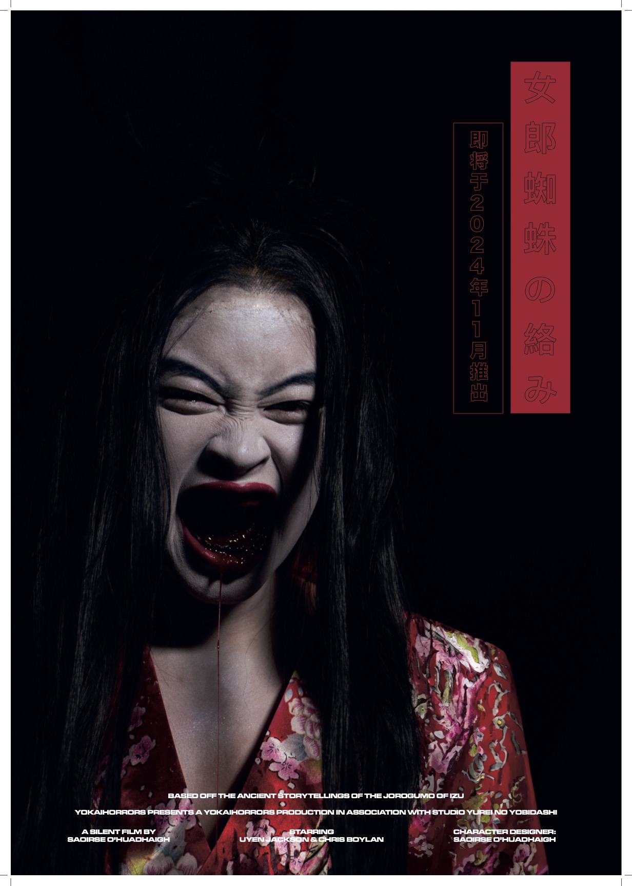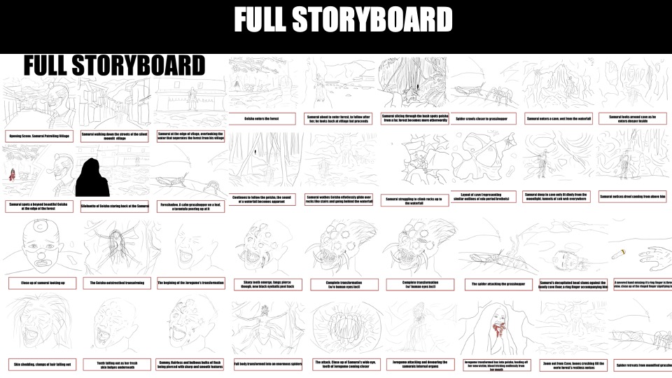 For my final college project, I wrote a silent film script centred on the Japanese Yokaī, the Jorōgumo. This supernatural entity, a shapeshifting woman who morphs into a monstrous spider, preys on a solitary wedded Samurai Warrior. The narrative unfolds as the Samurai encounters a captivating woman at the forest's edge, drawn into a mesmerising but perilous journey where reality blurs with myth. The pivotal moment reveals the woman's horrific transformation into the Jorōgumo, leading to a chilling confrontation. Through eerie imagery and suspenseful storytelling, the film depicts the Samurai's gruesome demise at the hands of the spider-like creature. Ultimately, the project delves into the unsettling intersection of myth and morality, leaving viewers with haunting reflections on the complexities of human nature and the allure of the unknown.