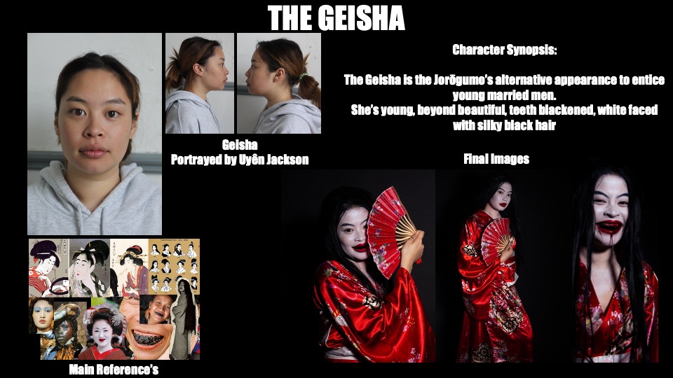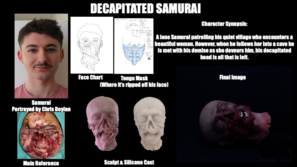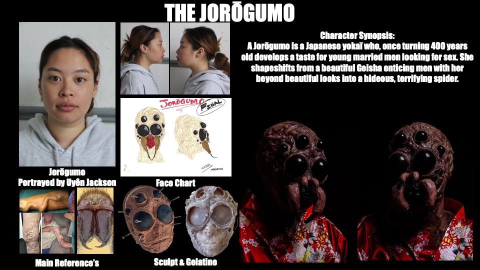 Through this storytelling, I designed and created my version of my Jorōgumo and the decapitated head of the Samurai Warrior, emphasising the climax of my script.