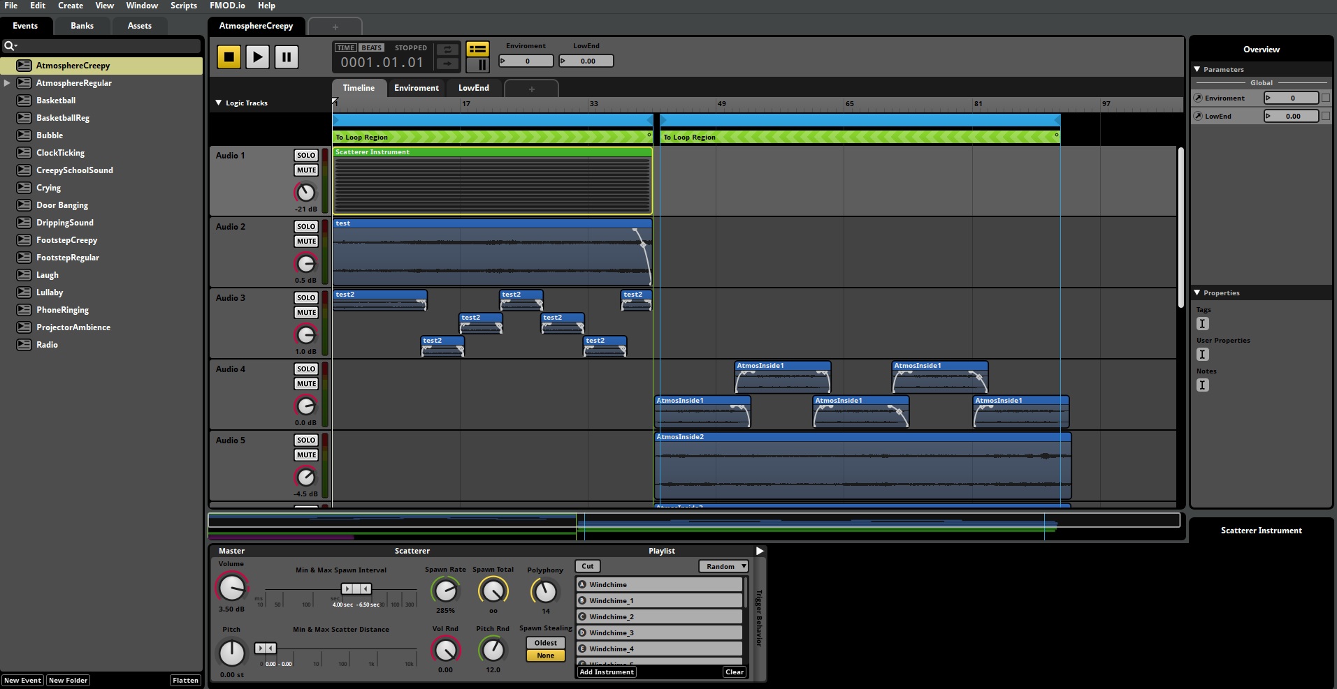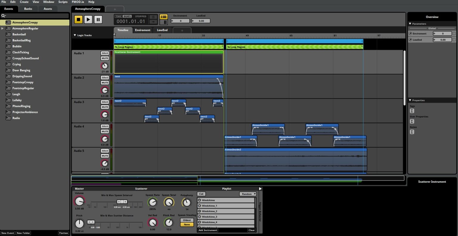 My aim with this project was to learn more about Game Audio. I created and implemented sounds for a walking simulator style game. These sounds are a combination of field recordings and synthesised sounds. One aspect I focused on was generative audio. This was to avoid repetitive sounds and loops. I utilised FMOD Studio's Scatterer instrument to play back specific sounds randomly so that the player would not grow tired of the audio. I also used this instrument to create background textures and music that would not repeat or loop. I tried to make the audio dynamic and created ambience for both the interior and exterior environment. I gained a lot of experience in Unity and FMOD from this project.