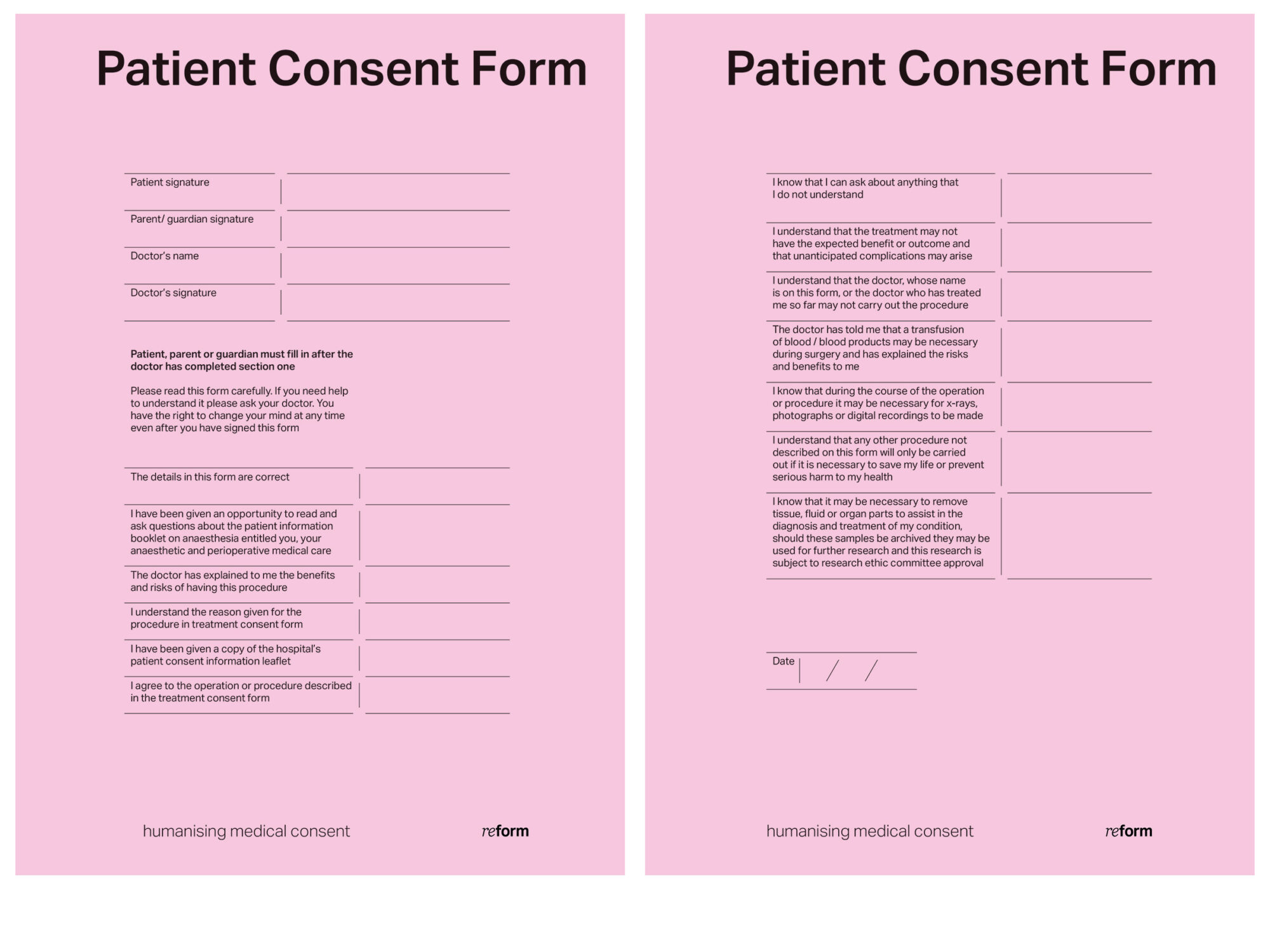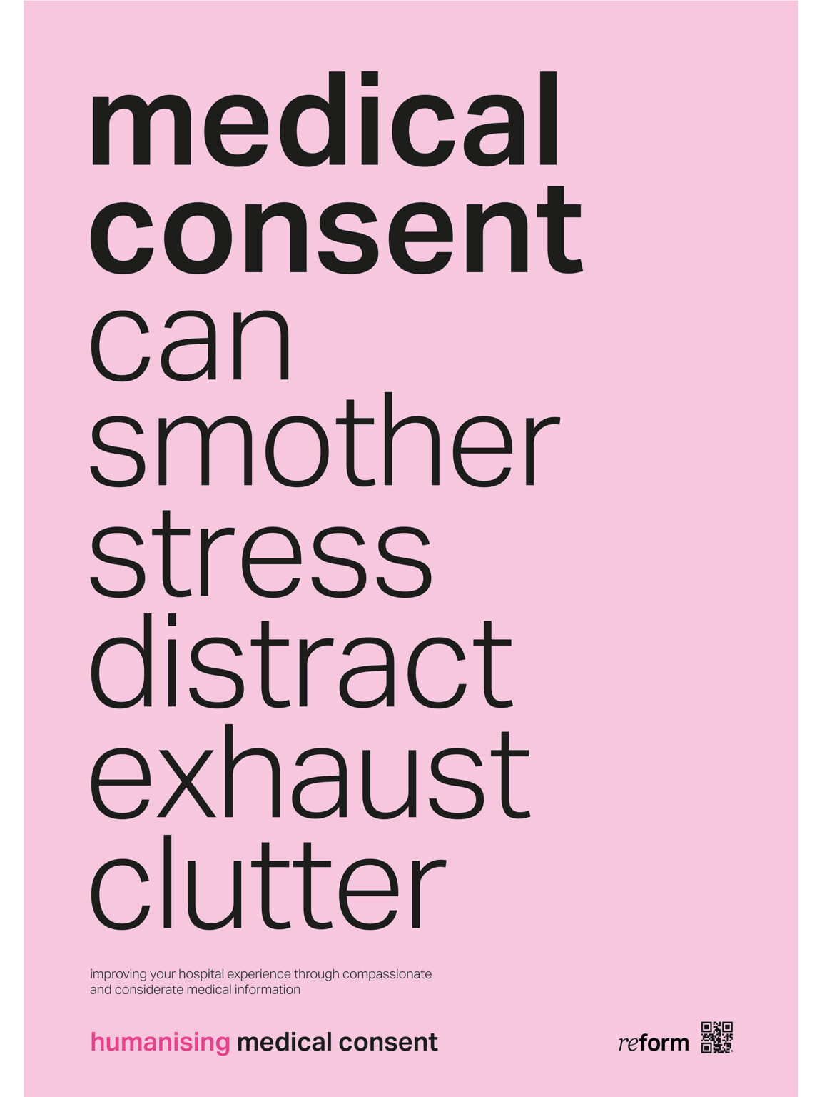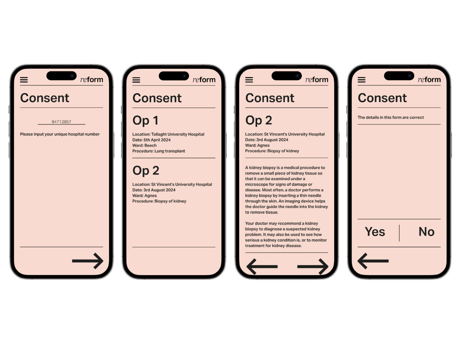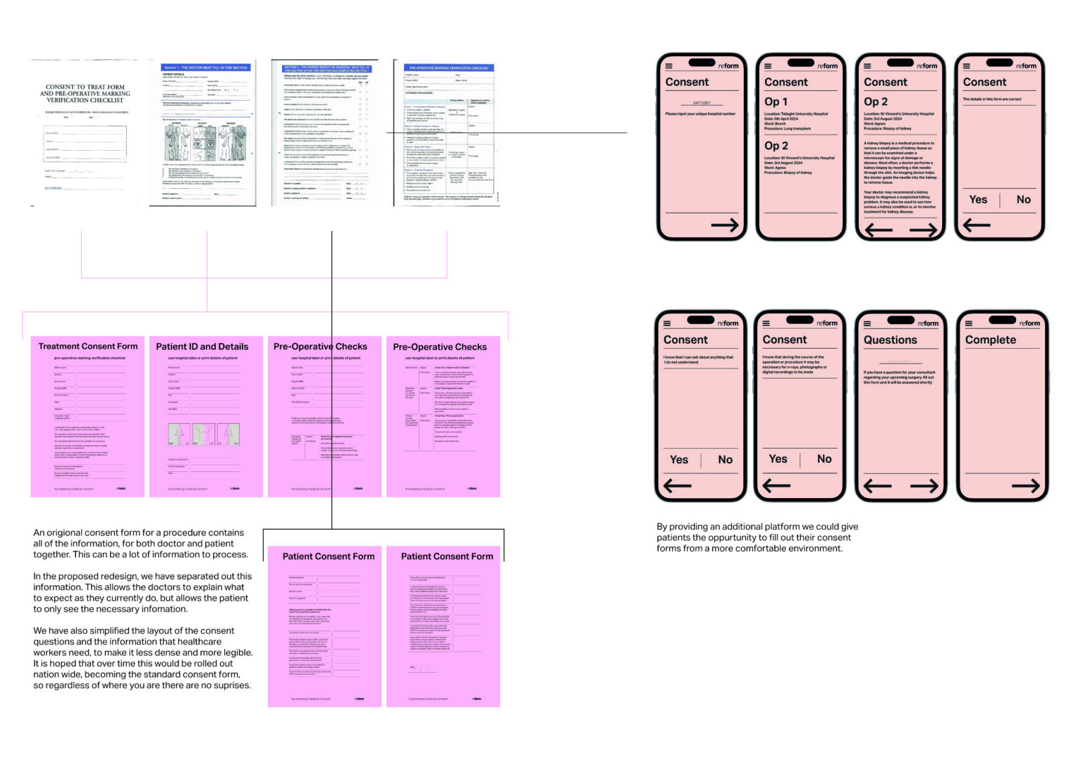 Reform is an advocacy group focused on patient care through the lens of receiving information. As hospitals will either directly or indirectly affect almost everyone, it was important to come up with an inclusive and accessible solution to the issue. By providing a platform and raising awareness, it aims to make the processing of medical information less overwhelming.
